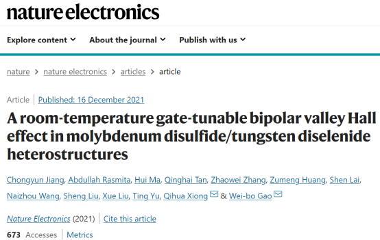 近日,我校伟德国际VICTOR1946青年教师马惠在《自然·电子学》(《Nature Electronics》)上发表了题为《A room-temperature gate-tunable bipolar valley Hall effect in molybdenum disulfide/tungsten diselenide heterostructures》的研究成果。马惠为该论文的共同第一作者,新加坡南洋理工大学高炜博教授和清华大学物理系熊启华教授为通讯作者。该项成果为马惠2018年在新加坡南洋理工大学做访问学者期间与合作者共同开展,并于访学回国后持续合作完成的。《Nature Electronics》是有重要影响的国际学术期刊,影响因子长期保持在30以上。