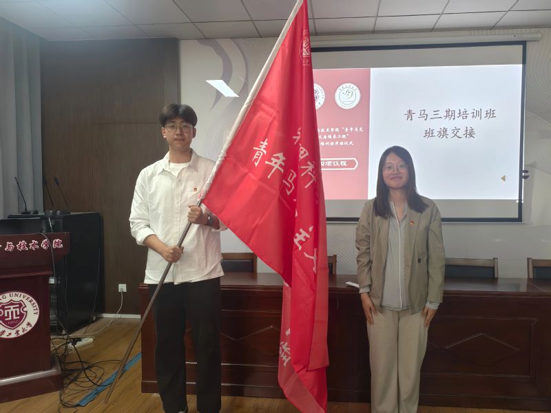 学院团委指导教师李一凡为第三期培训班授予班旗,鲜红的班旗象征着青马精神品格的延续。
