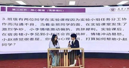 “推心置腹(情景模拟)”环节是对选手实际解决问题能力的考验。白一暘同学根据给定的情景,迅速进入角色,运用所学的心理学知识和沟通技巧,与模拟对象进行了有效的沟通和交流,成功解决了情景中的心理问题。