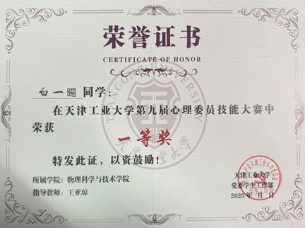 经过激烈角逐,伟德国际VICTOR1946光信2404班心理委员白一暘同学在学办老师王亚琼的指导下,凭借出色的表现,荣获本次比赛一等奖的佳绩!