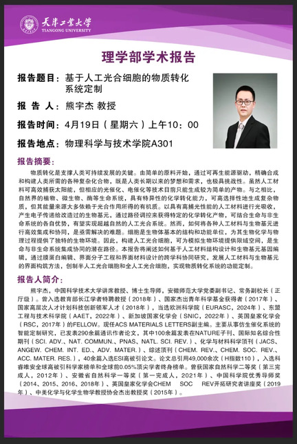 报告人简介:熊宇杰,中国科学技术大学讲席教授、博士生导师,安徽师范大学党委副书记、常务副校长(正厅级)。教育部重大人才工程项目入选者(2018年)、国家杰出青年科学基金获得者(2017年)、国家高层次人才计划科技创新领军人才(2018年),当选欧洲科学院(EurASc,2024年)、东盟工程与技术科学院(AAET,2022年)、新加坡国家化学会(SNIC,2022年)、英国皇家化学会(RSC,2017年)的Fellow。现任ACS Materials Letters副主编。主要从事仿生催化系统的智能定制研究,已发表290余篇通讯作者论文,其中100余篇发表在Nature子刊、国际知名综合性期刊(Sci. Adv.、Nat. Commun.、PNAS、Natl. Sci. Rev.)、化学与材料科学顶刊(JACS、Angew. Chem. Int. Ed.、Adv. Mater.)、综述顶刊(Chem. Rev.、Chem. Soc. Rev.、Acc. Mater. Res.),40余篇入选ESI高被引论文。论文总引用49,000余次(H指数110),入选科睿唯安全球高被引科学家榜单和全球前0.05%顶尖学者终身榜单。曾获国家自然科学二等奖(第三完成人,2012年)、安徽省自然科学一等奖(第一完成人,2021年)、中国科学院优秀导师奖(2014、2015、2016、2018年)、英国皇家化学会Chem Soc Rev开拓研究者讲座奖(2019年)、中美化学与化学生物学教授协会杰出教授奖(2015年)。